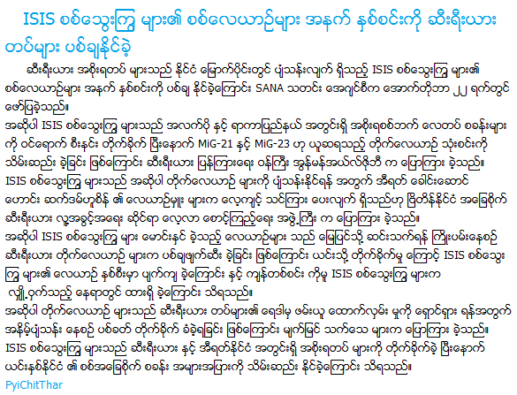 http://www.dailymail.co.uk/news/article-2803457/Syria-destroys-two-warplanes-used-ISIS-train-fighter-pilots-terrorist-airforce.html